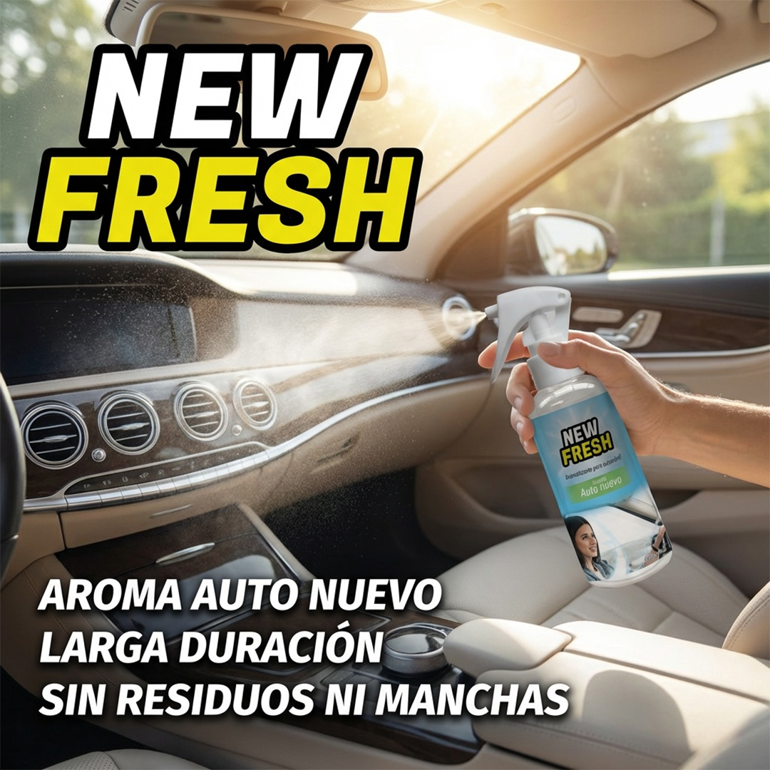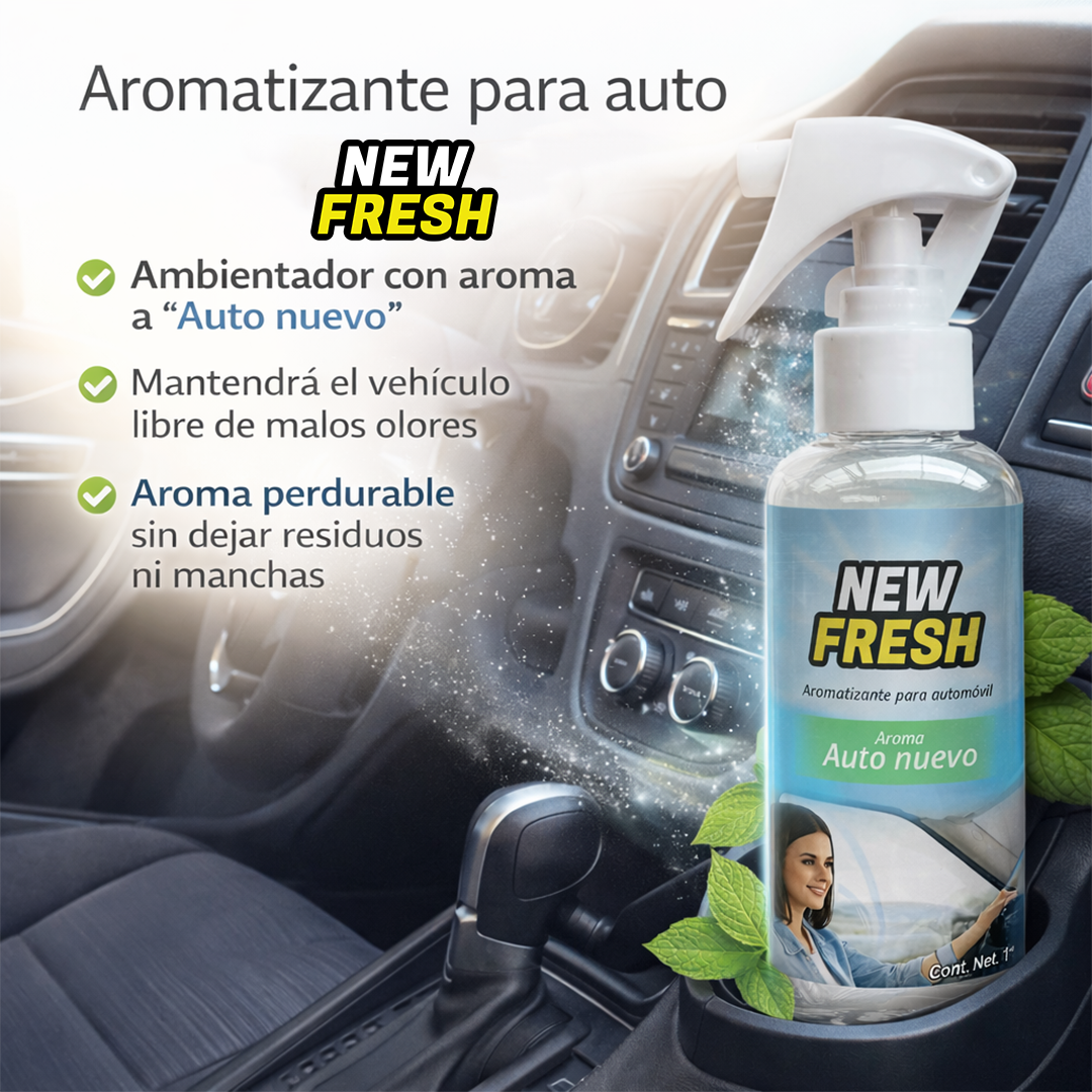 New Fresh es el aromatizante premium con aroma a “auto nuevo” que transforma cada trayecto en una experiencia fresca y placentera. Gracias a su avanzada fórmula encapsuladora, elimina de raíz incluso los olores más intensos como el del cigarro, comida o humedad, dejando un ambiente limpio, agradable y duradero en el interior de tu vehículo.